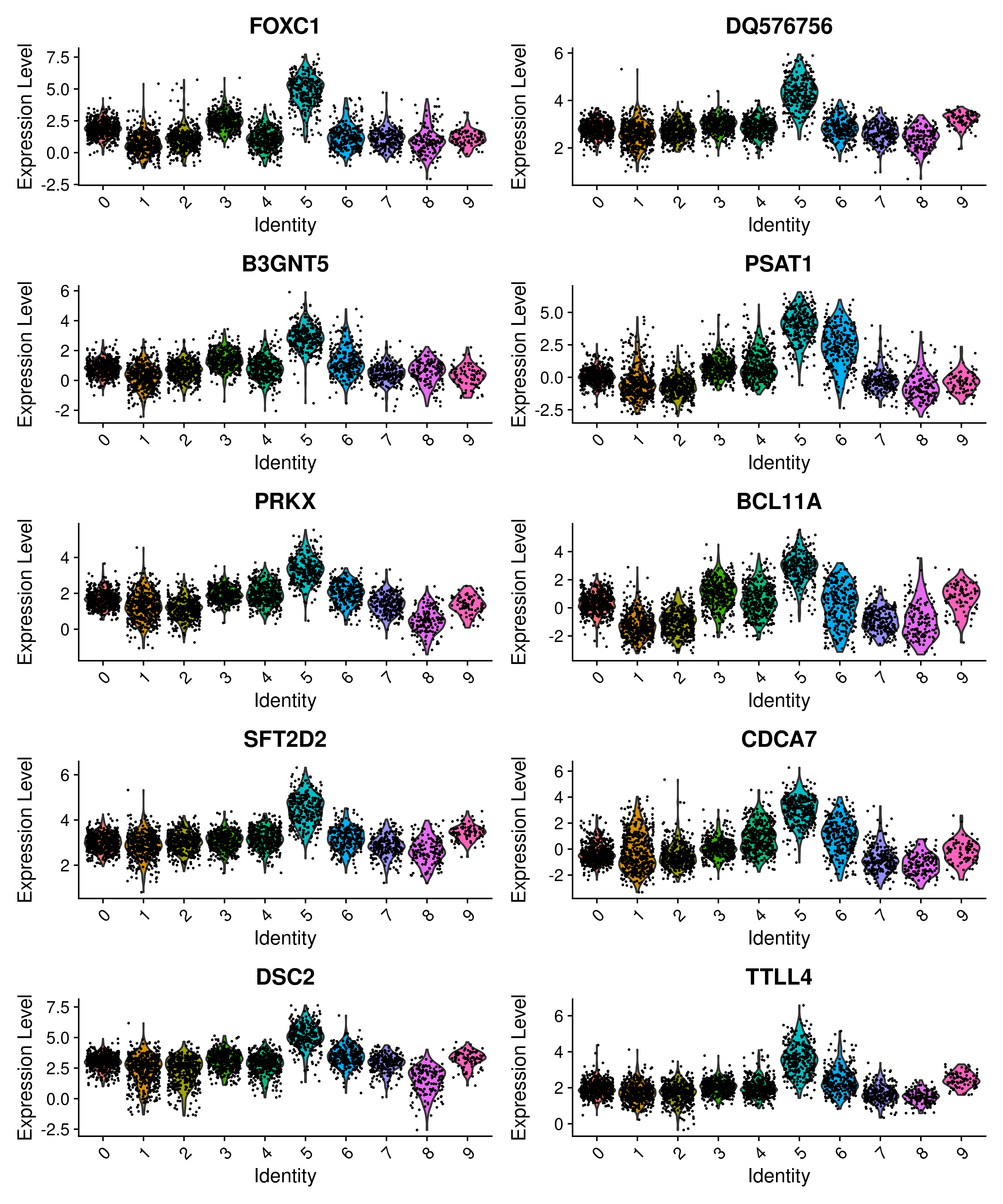 - identify upregulated (positive) and downregulated (negative) markers of the Basal cluster (cluster 5) compared to all the others;