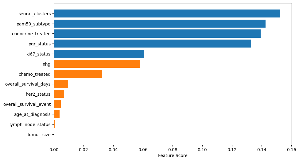 Feature without missing values: ['age_at_diagnosis', 'pam50_subtype', 'overall_survival_days', 'overall_survival_event', 'seurat_clusters']