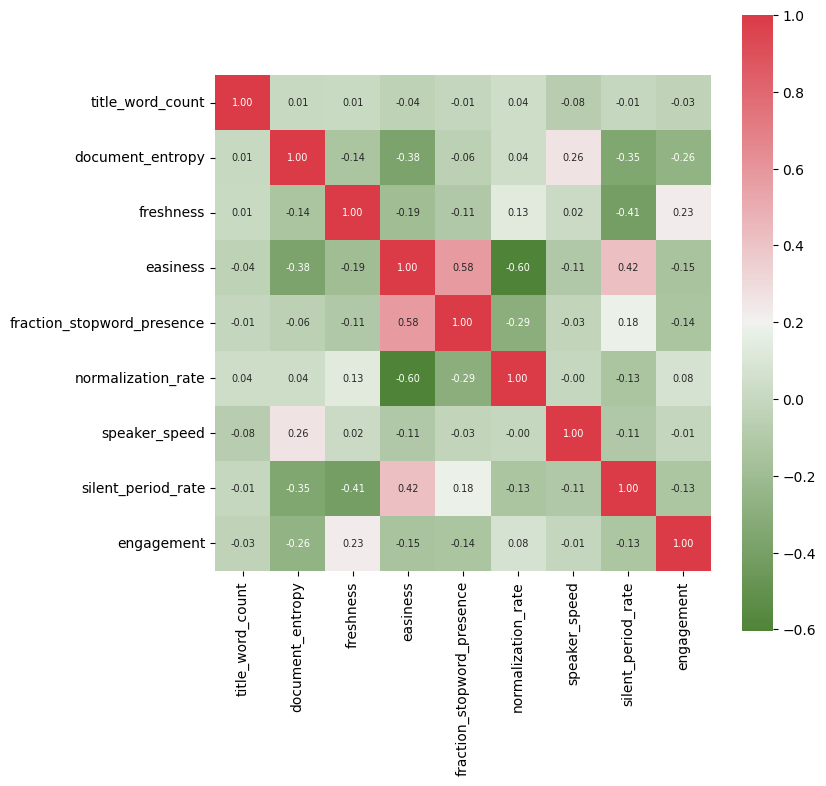 easiness - A text difficulty measure applied to the transcript. A lower score indicates more complex language used by the presenter.