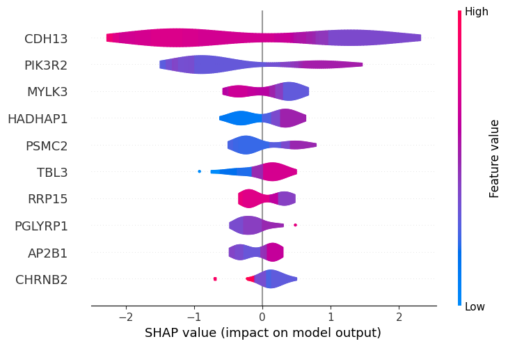 Looking at the plot, we can conclude for example that participants with low levels of CDH13 and high levels of PIK3R2 and PSMC2 are associated with weight loss.