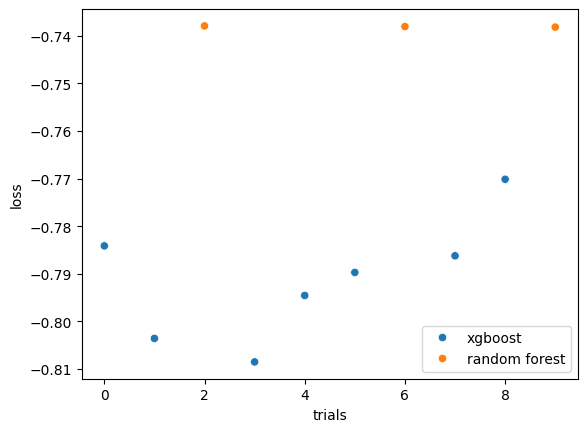 I also compared two tree-based approaches XGBoost and Random Forest. In this dataset, XGBoost outperformed Random Forest as it showed lower loss over trials.