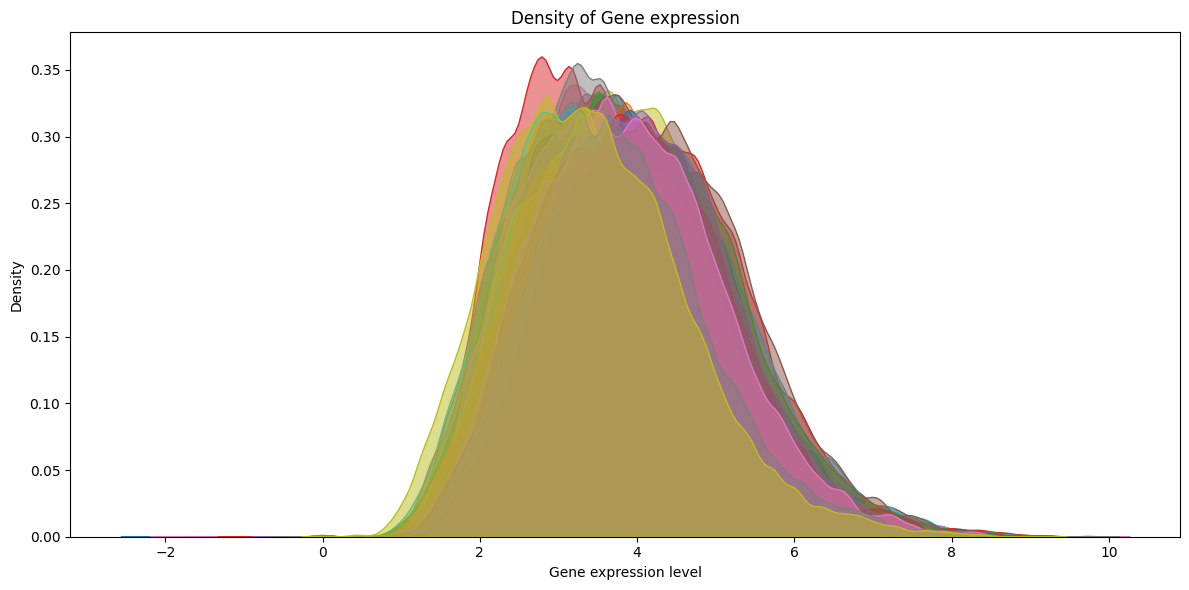 import matplotlib.pyplot as pltimport seaborn as snsplt.figure(figsize=(12, 6))# plot density for each samplefor i inrange(X.shape[0]): sns.kdeplot(X.iloc[i,:], bw_adjust=0.5, fill=True, alpha=0.5)plt.title('Density of Gene expression')plt.xlabel('Gene expression level')plt.ylabel('Density')plt.tight_layout()plt.show()
