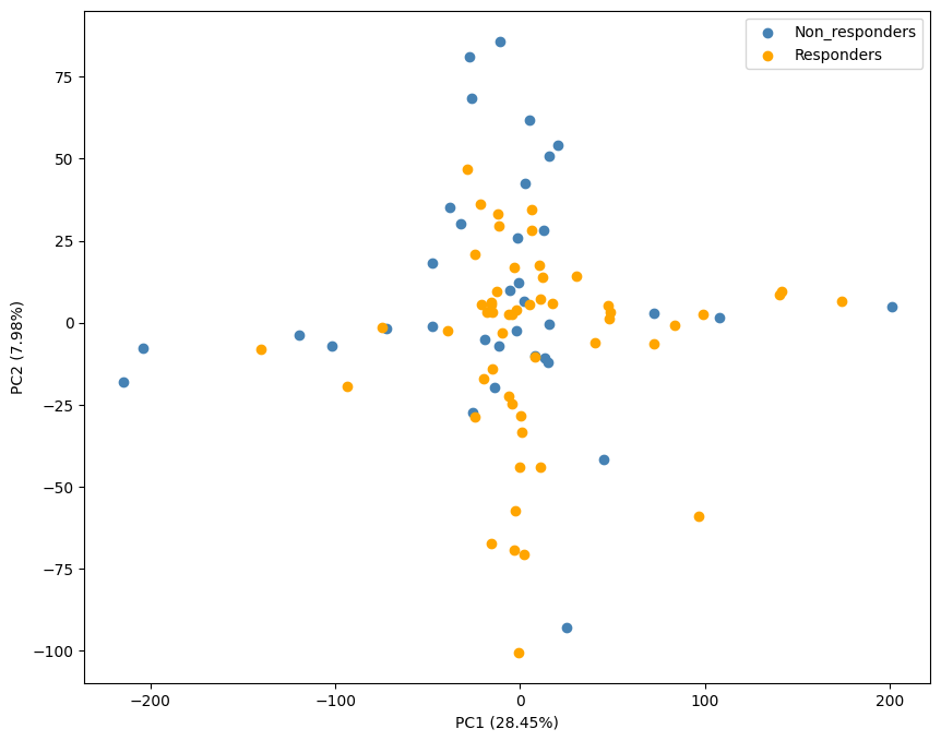 import numpy as npfrom sklearn.decomposition import PCAfrom sklearn.preprocessing import StandardScaler# standardize the featuresscaler = StandardScaler()X_scaled = scaler.fit_transform(X)# PCApca = PCA()X_pca = pca.fit_transform(X_scaled)# scatter plot of the first two principal componentsplt.figure(figsize=(10, 8))labels = Yinv_mapping = {v: k for k, v in mapping.items()}plt.scatter(X_pca[labels==0, 0], X_pca[labels==0, 1], color='steelblue', label=inv_mapping[0])plt.scatter(X_pca[labels==1, 0], X_pca[labels==1, 1], color='orange', label=inv_mapping[1])plt.legend()plt.xlabel('PC1 ({:.2f}%)'.format(pca.explained_variance_ratio_[0] *100))plt.ylabel('PC2 ({:.2f}%)'.format(pca.explained_variance_ratio_[1] *100))plt.show()